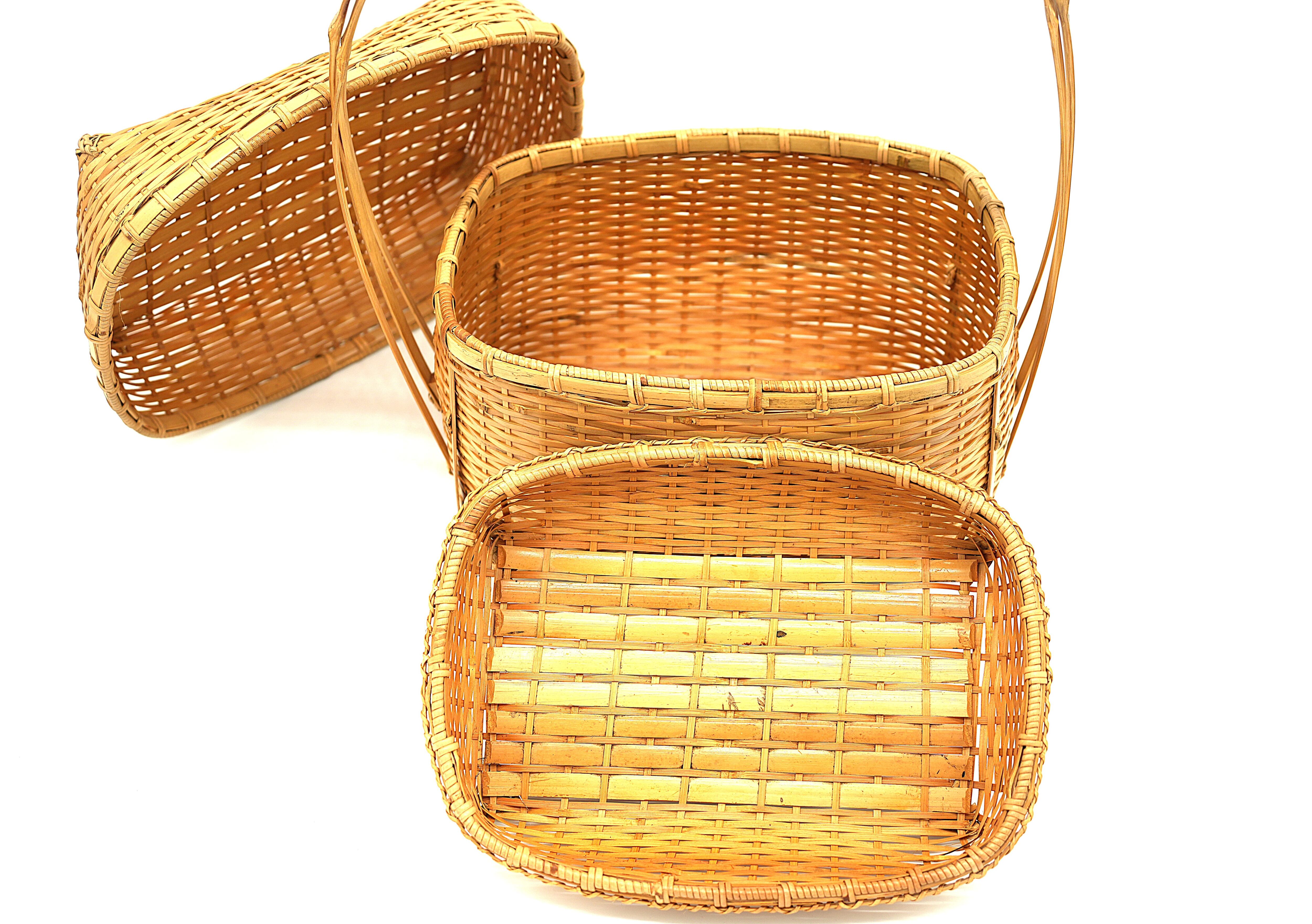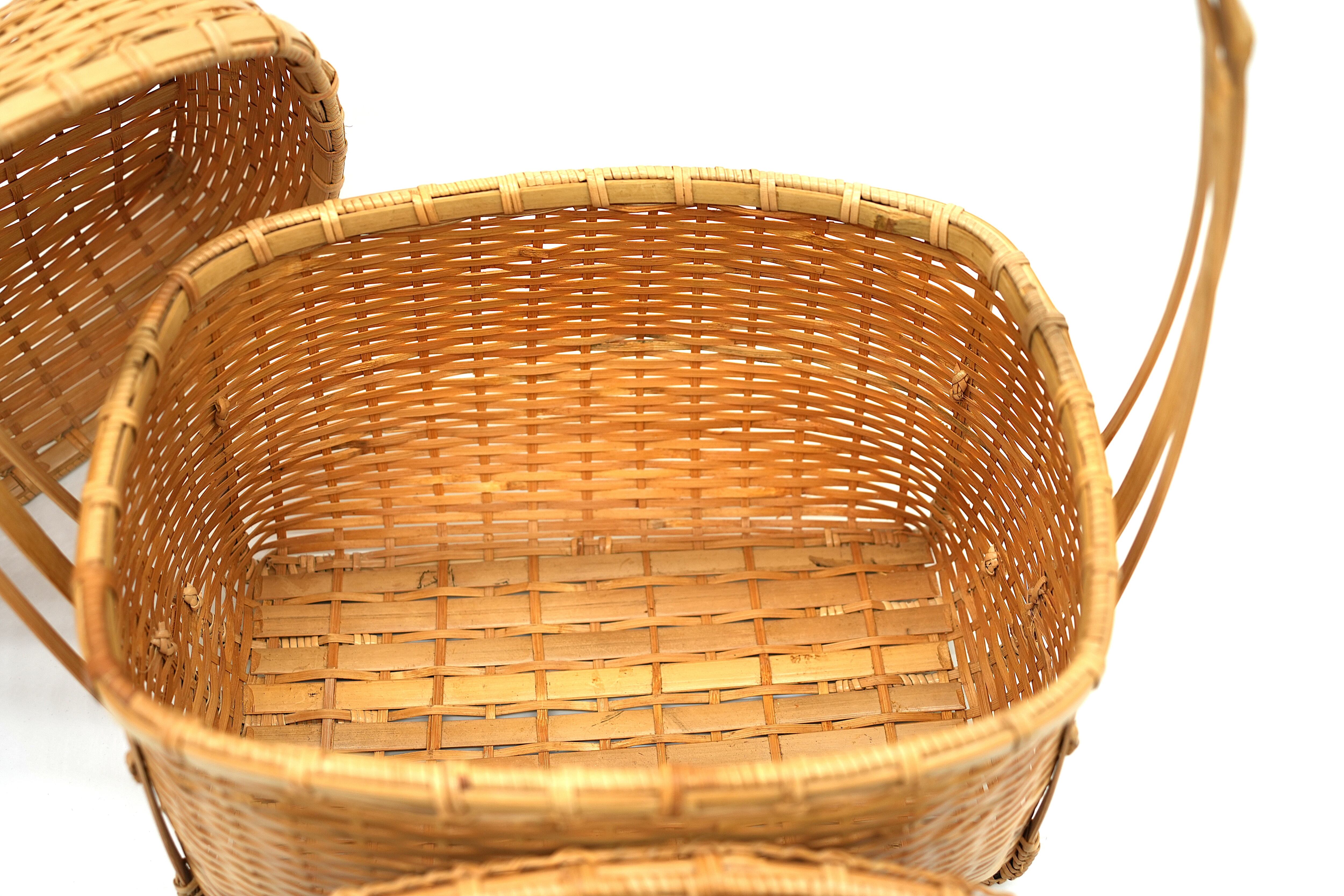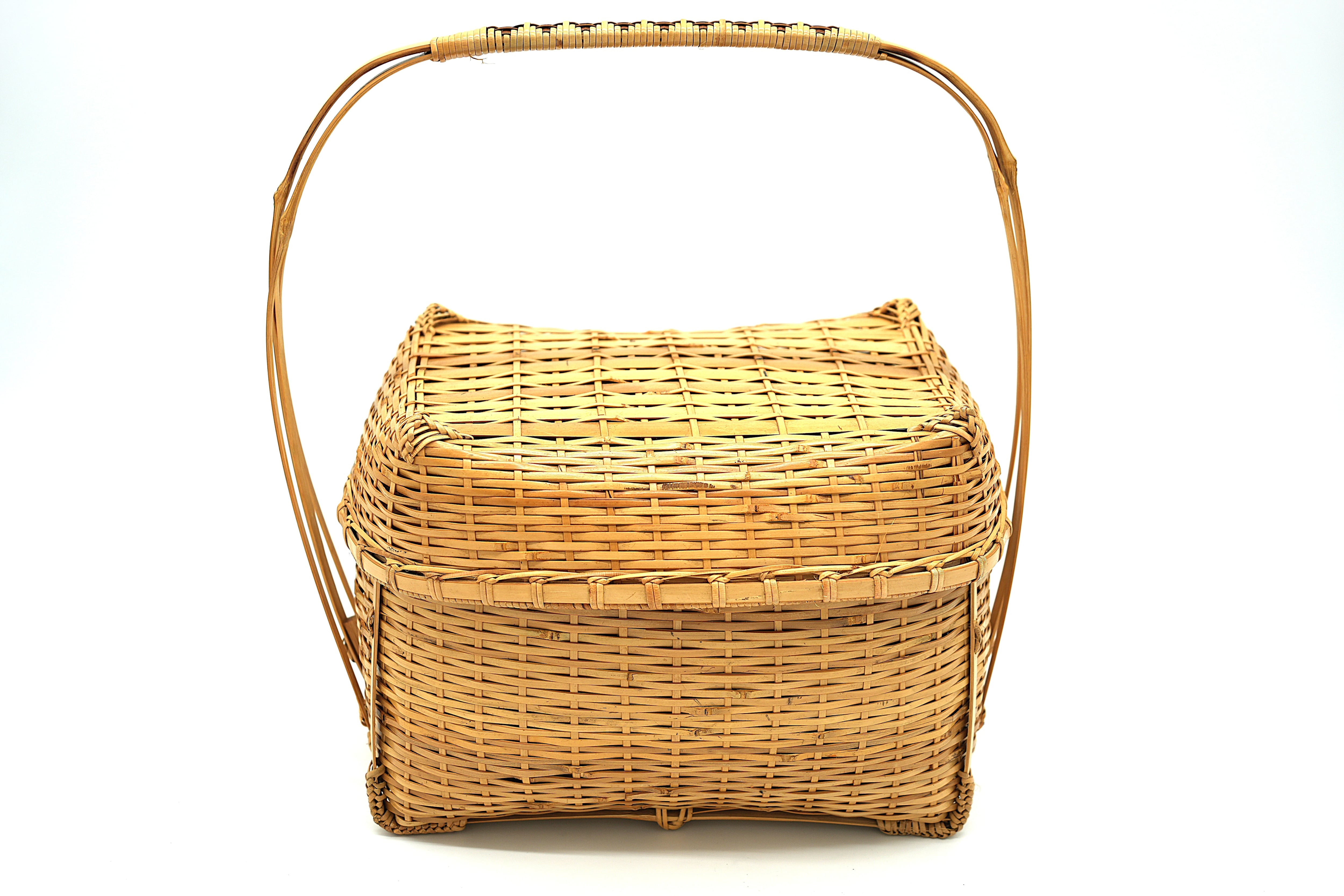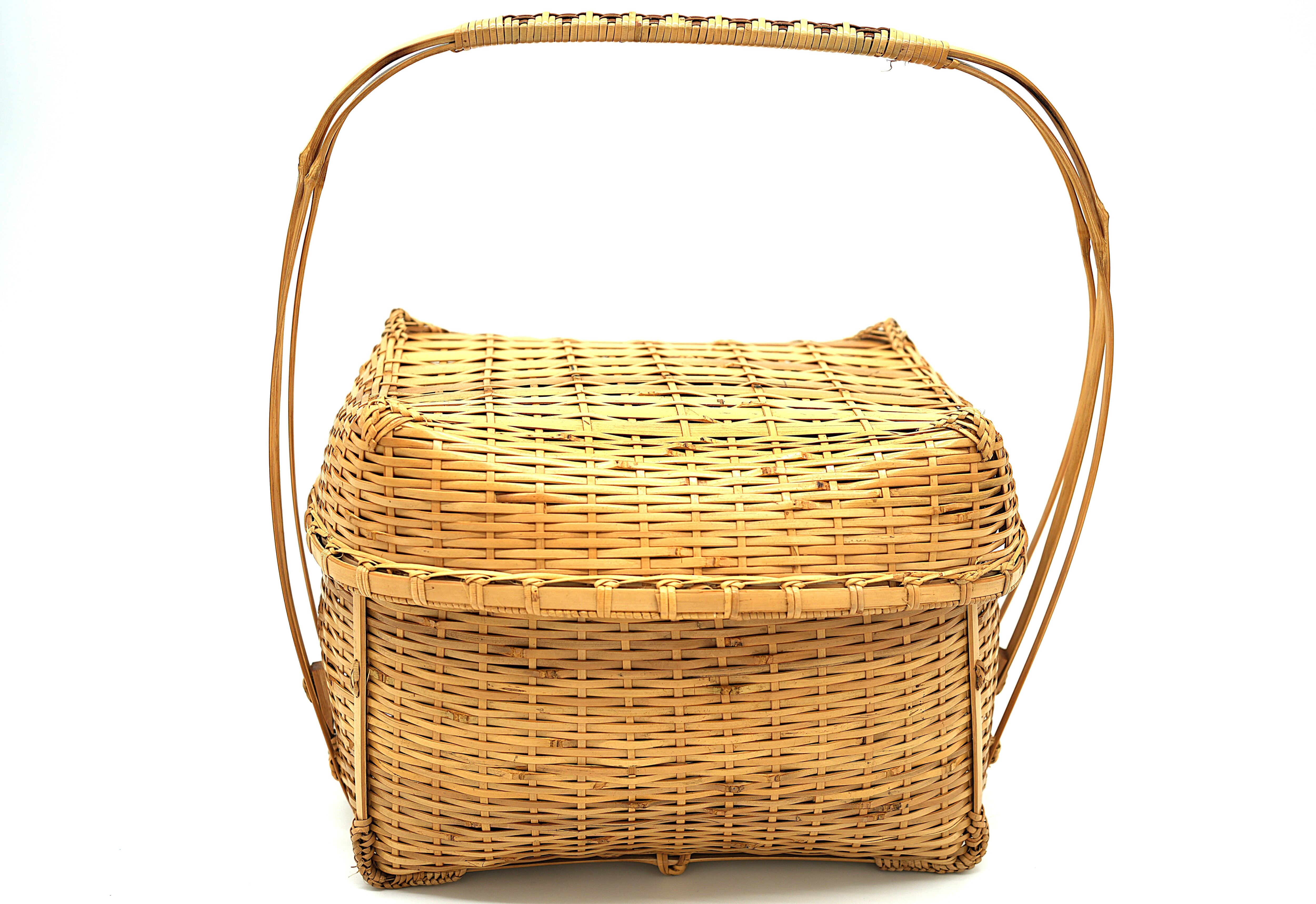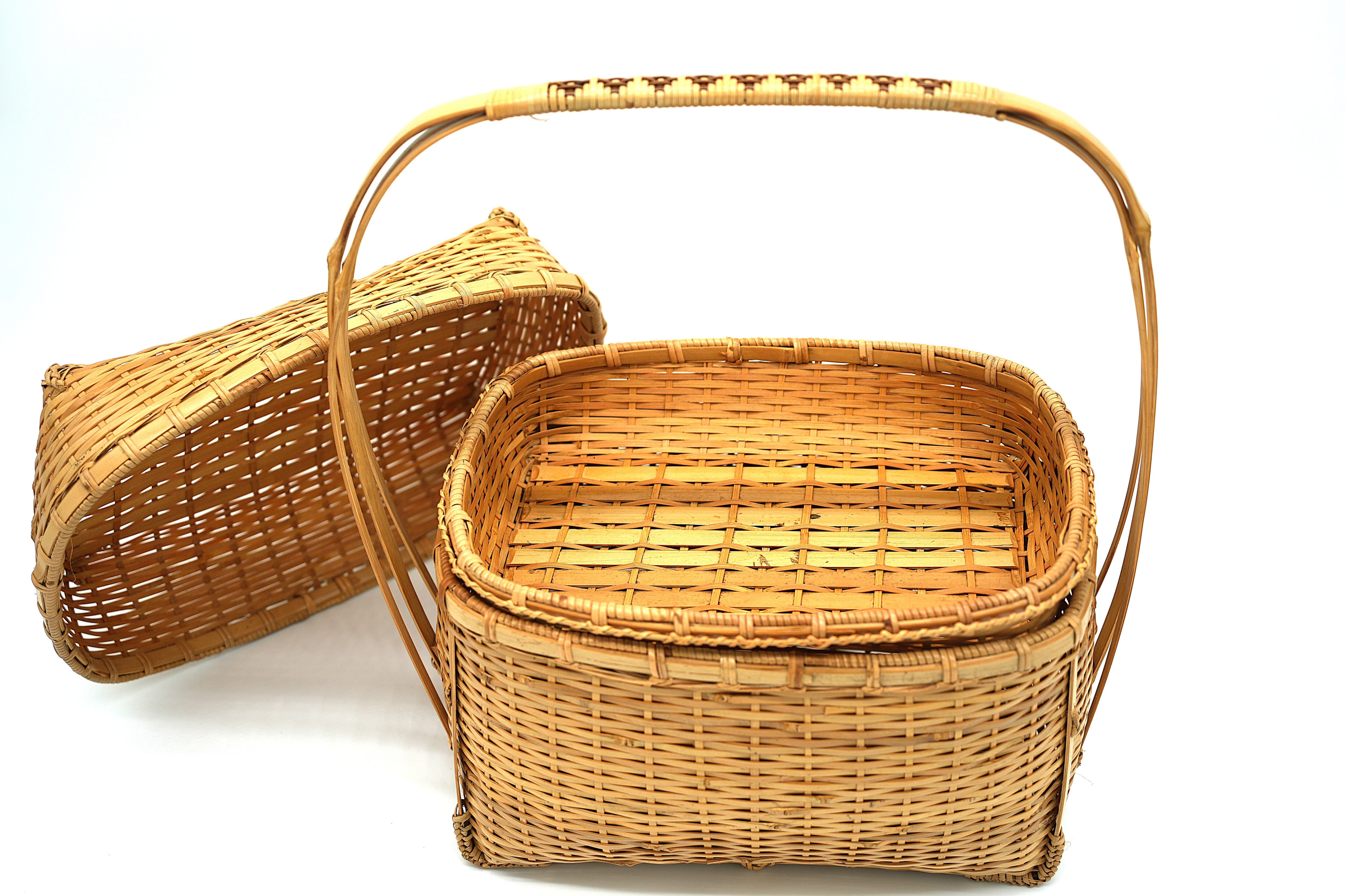 こちらのバスケットは蓋を開けると中蓋があり収納部が二段に区切れる為、使い勝手がとてもよいピクニックバスケットです。お花見や普段のお出かけなど幅広いシーンで活用いただけるサイズ感の良いバスケットです。