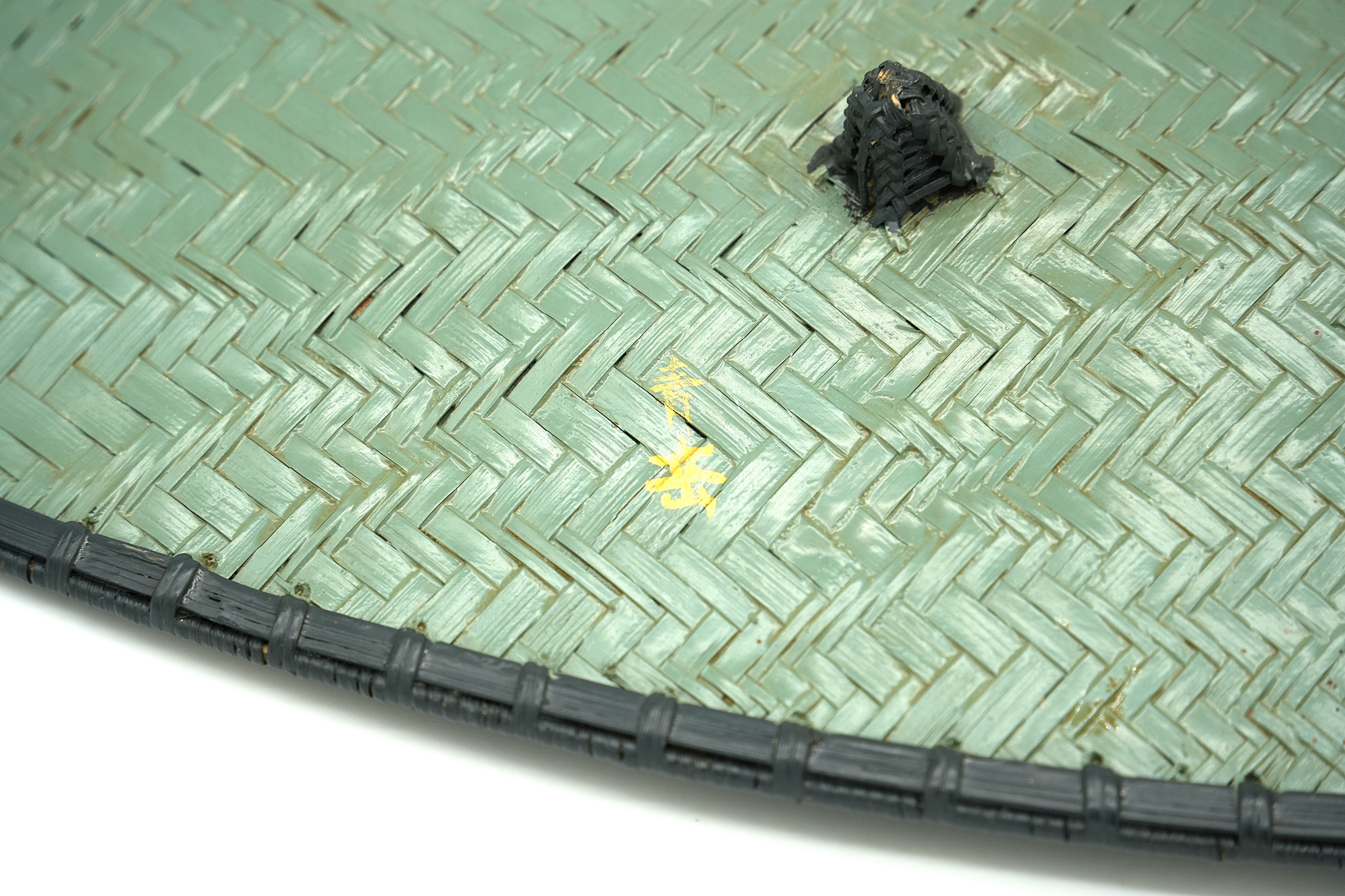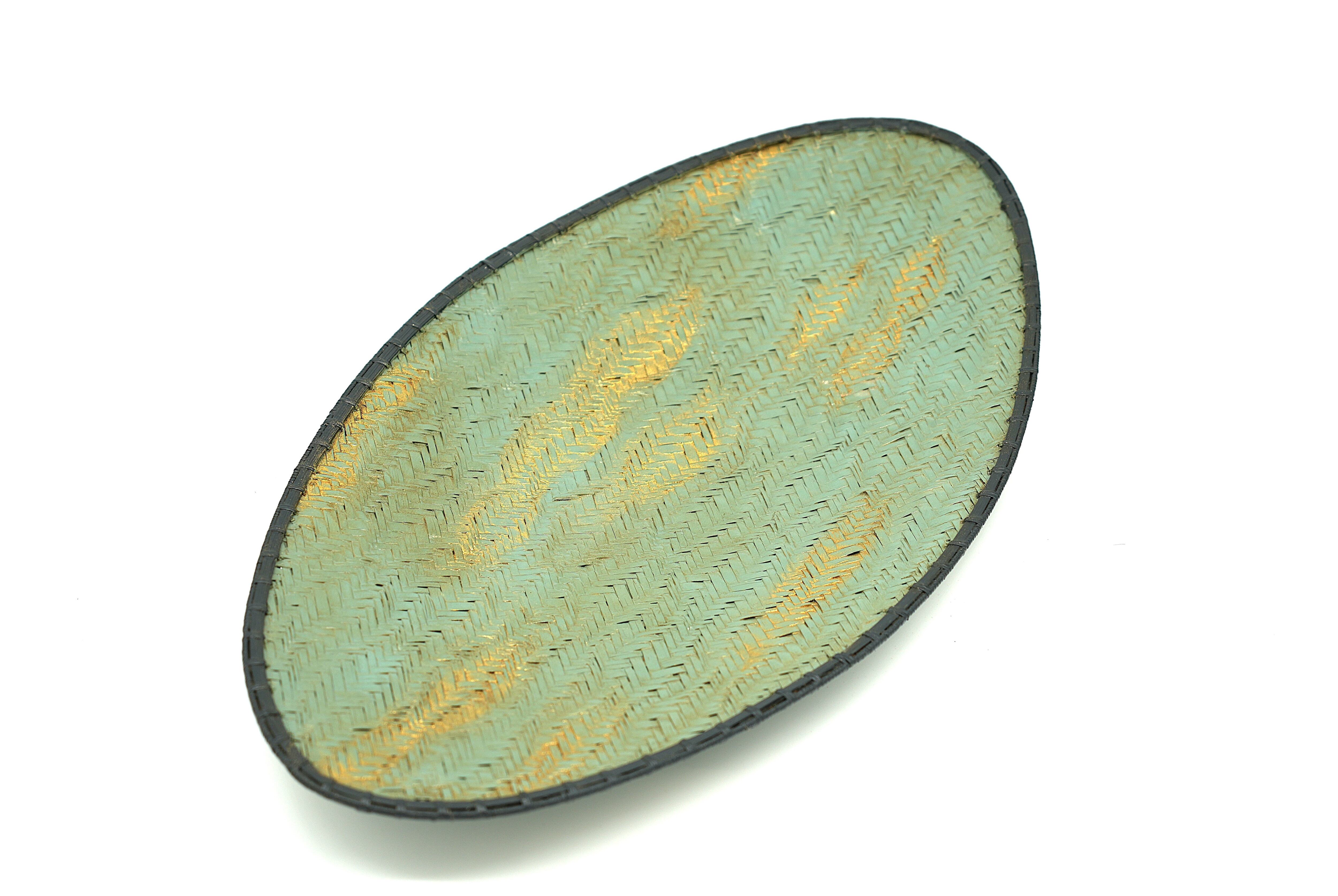 This piece is a plate woven in a rope pattern, coated with aqua blue lacquer, and adorned with gold leaf.