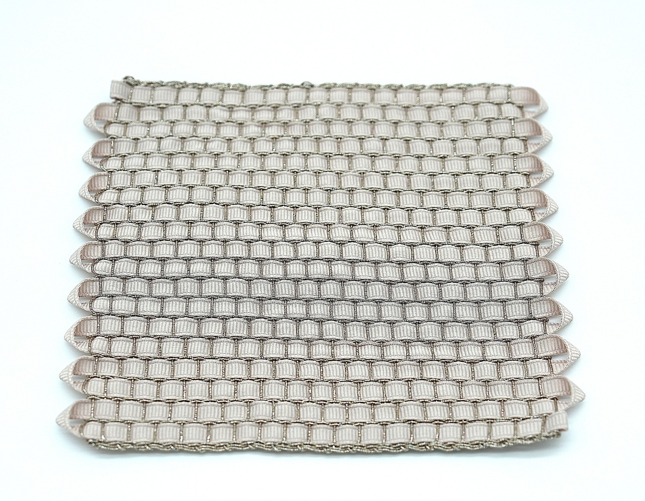 ラメ糸の経糸にリボンを緯糸に織り込んだ優しい色のドイリー。