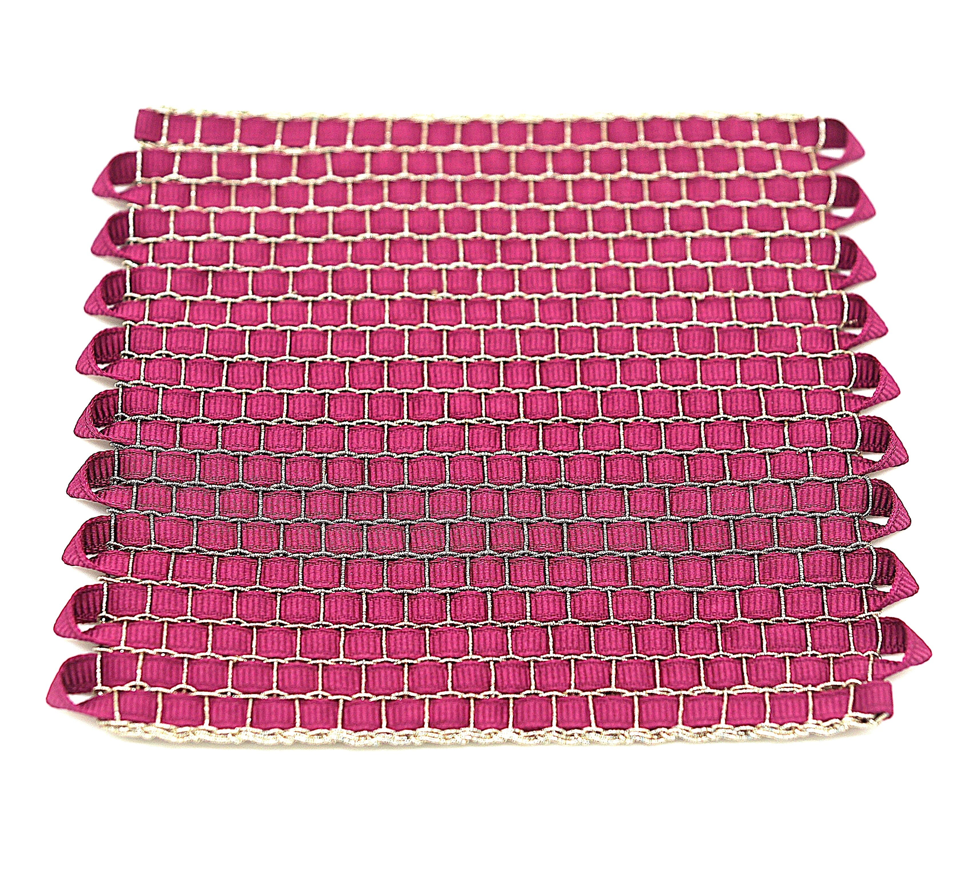 ラメ糸の経糸にリボンを緯糸に織り込んだ優しい色のドイリー。