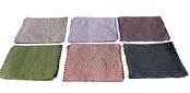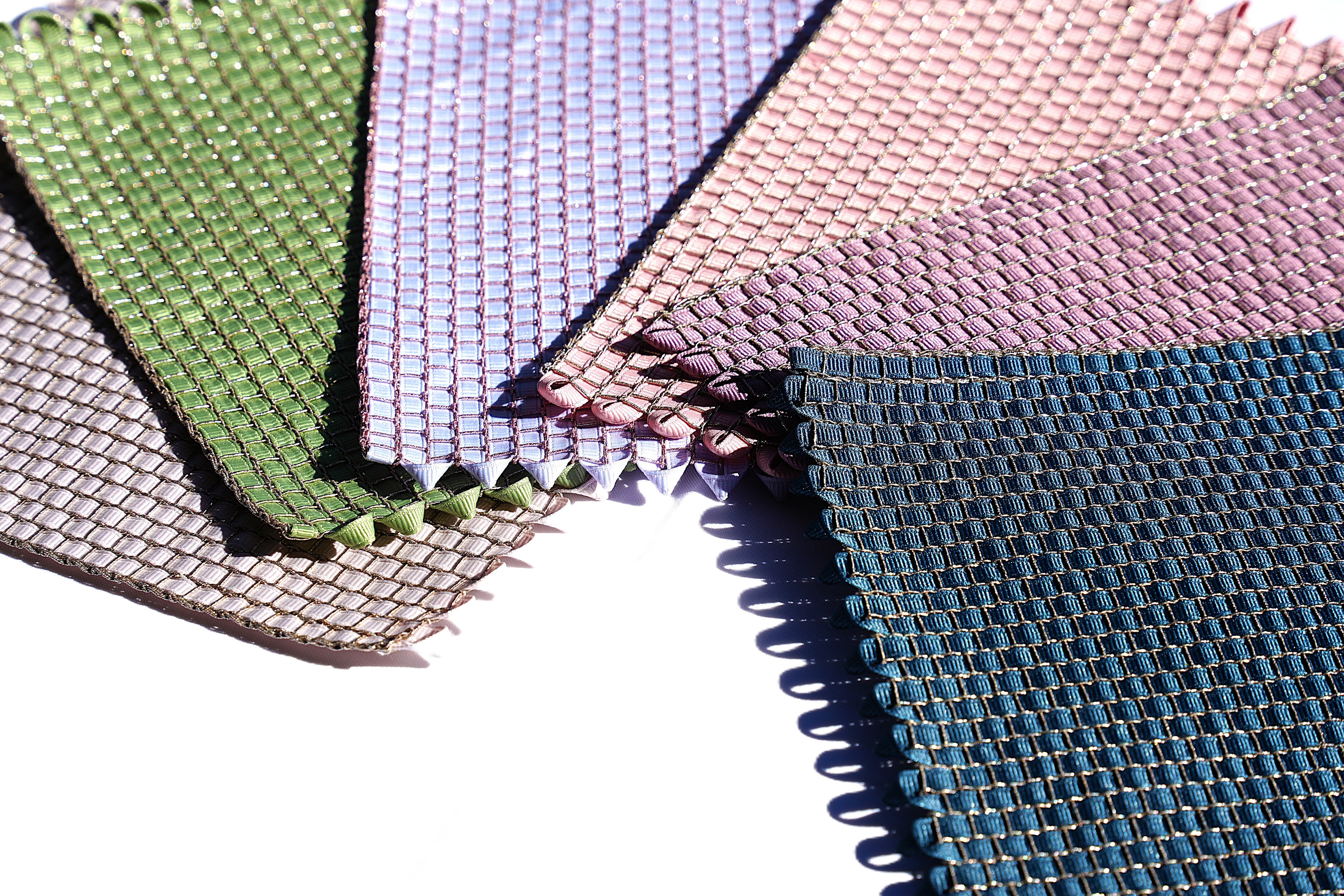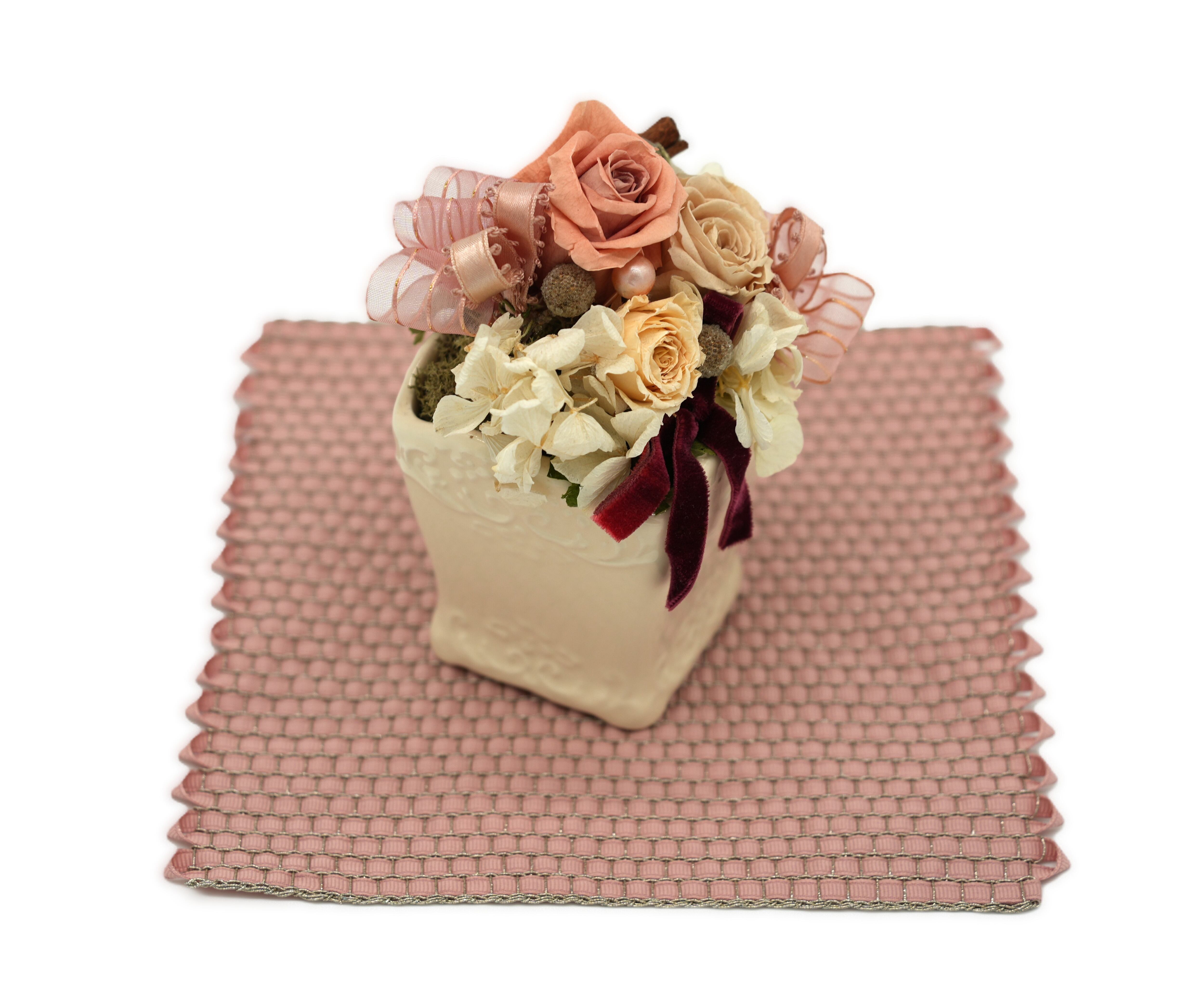 ラメ糸の経糸にリボンを緯糸に織り込んだドイリー。発色が良くポットマットなどのテーブルウェアや花瓶、写真立てのマットとして置物がよく映えます。ネットに入れて洗えます。乾燥機はお避けください。