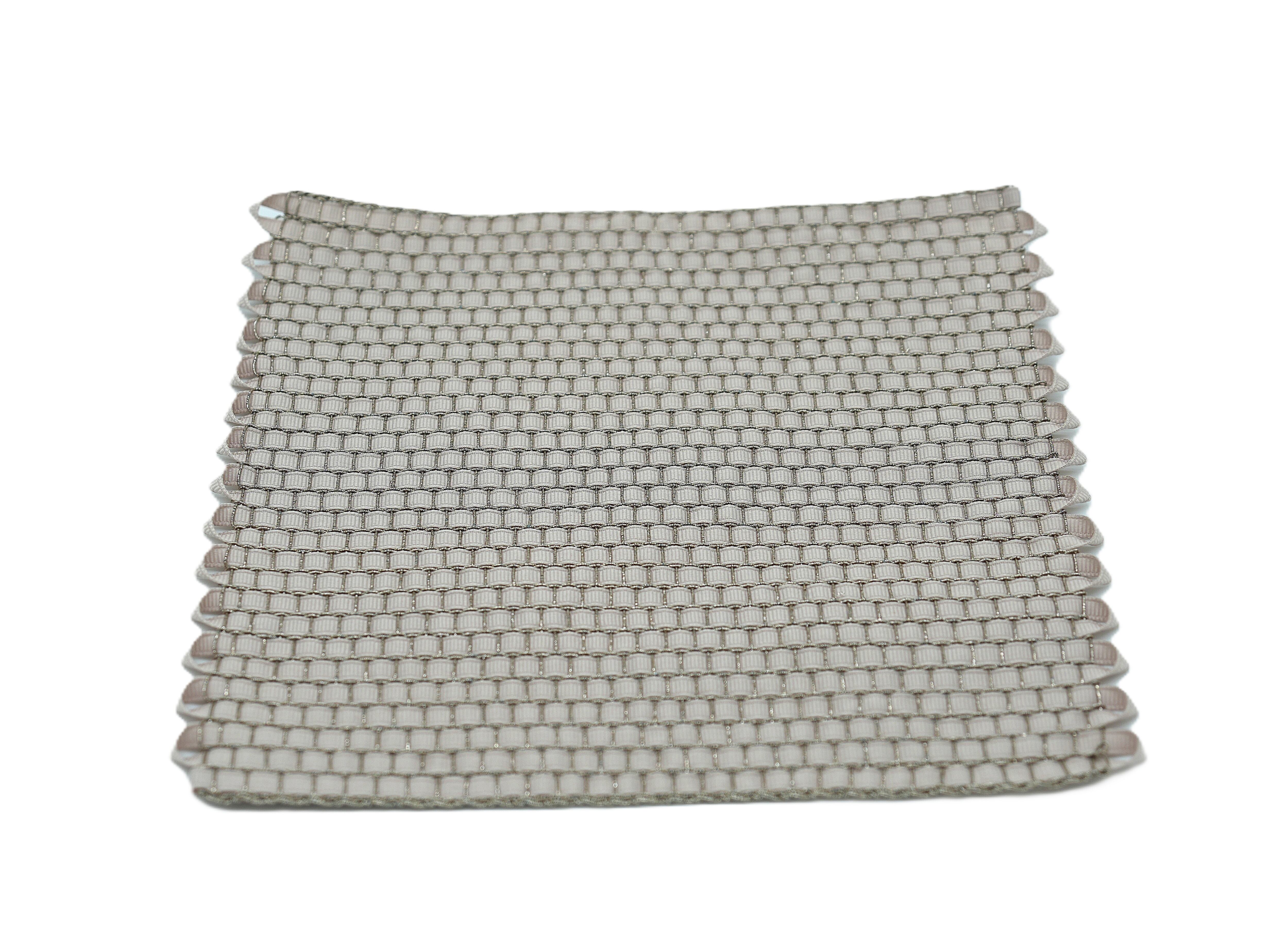 ラメ糸の経糸にリボンを緯糸に織り込んだ優しい色のドイリー。