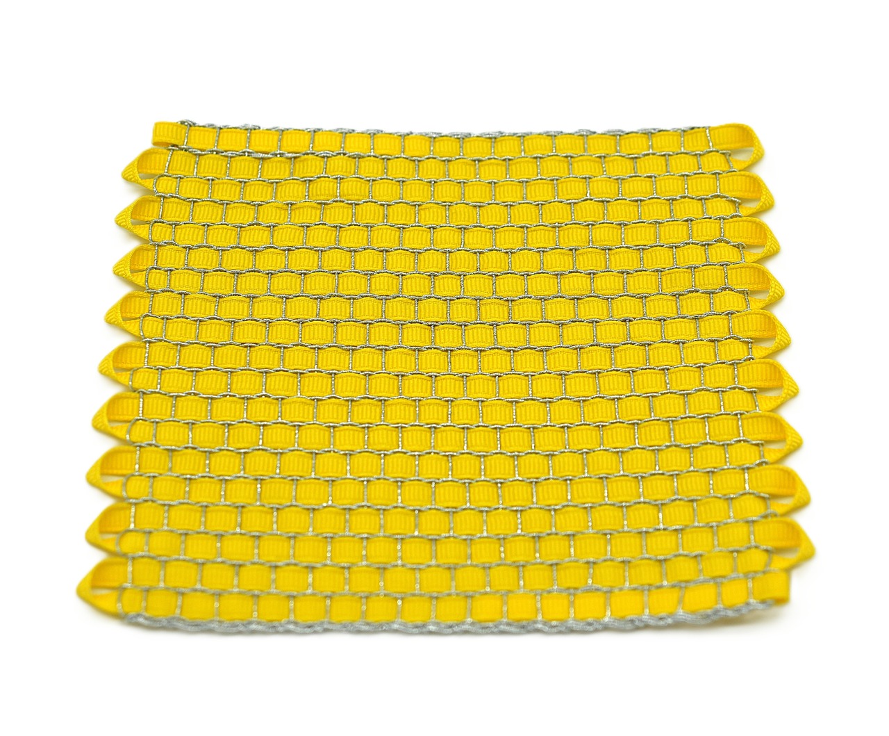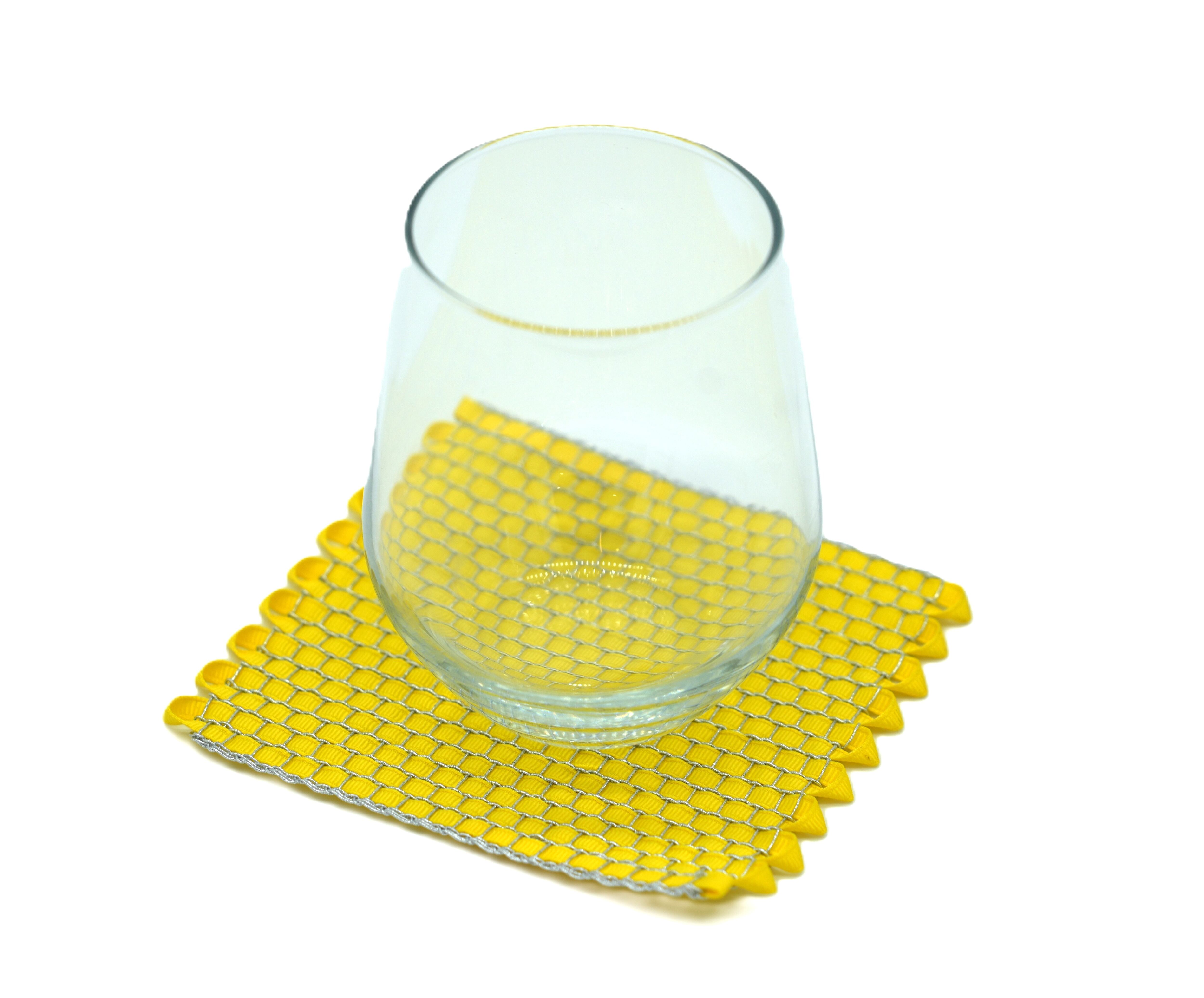 A doily in soft colors woven with shimmering thread as the warp and ribbon as the weft. Its vivid colors make it perfect as a tableware accessory, coaster, or a mat for vases and ornaments, enhancing the appearance of small items. Can be washed in a laundry net. Avoid using a dryer.