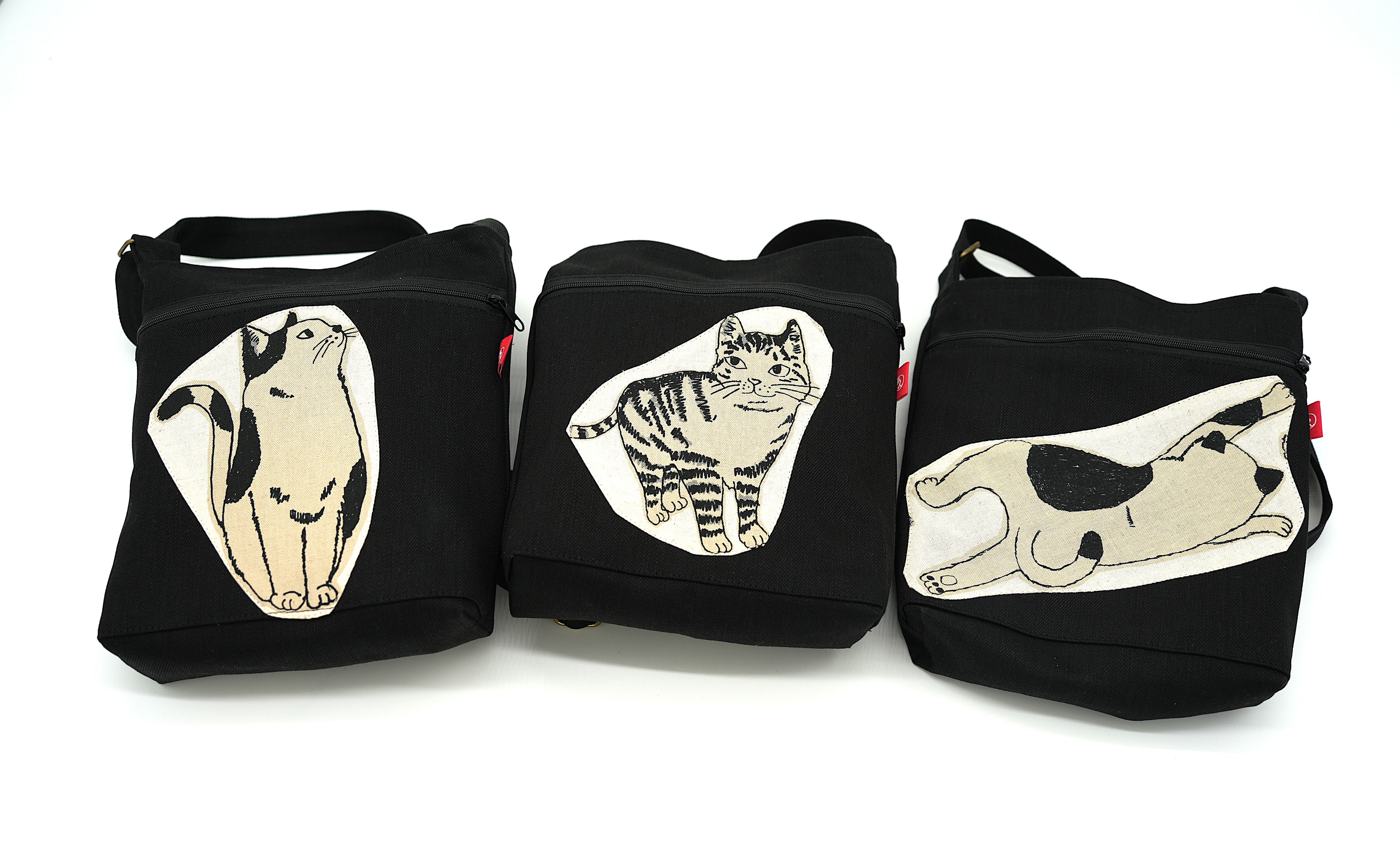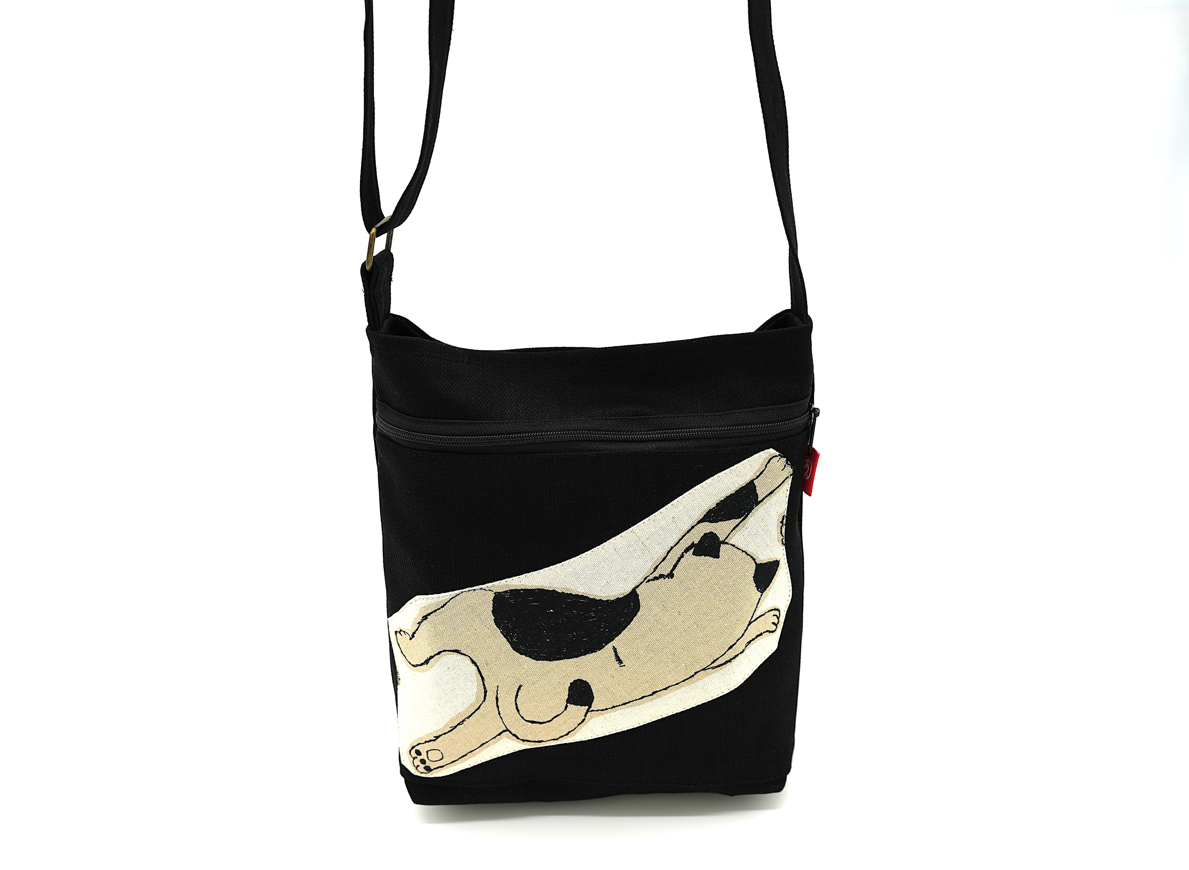 This shoulder bag features an amusing cat pattern design with a unique, relaxed look that is hard to describe.