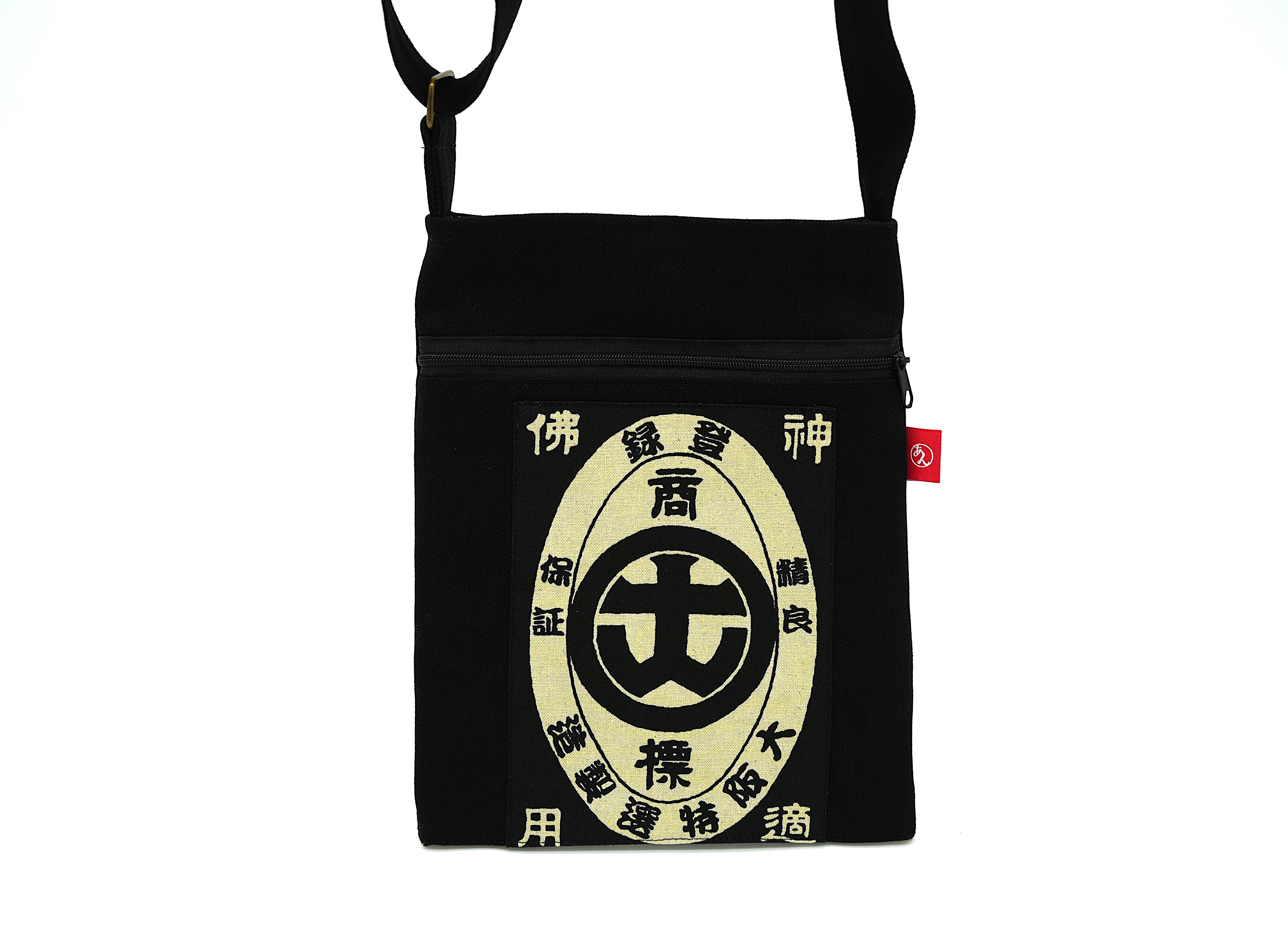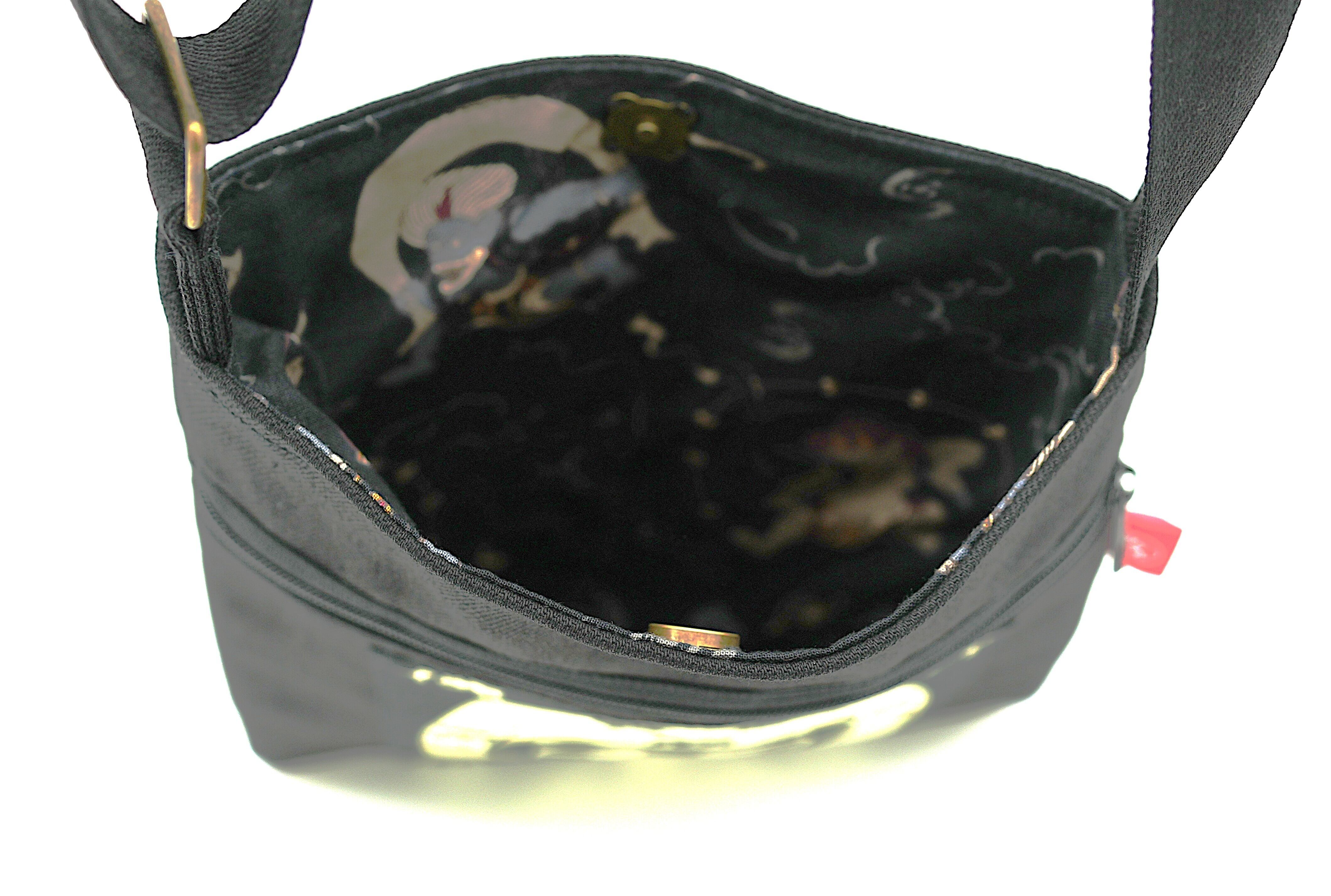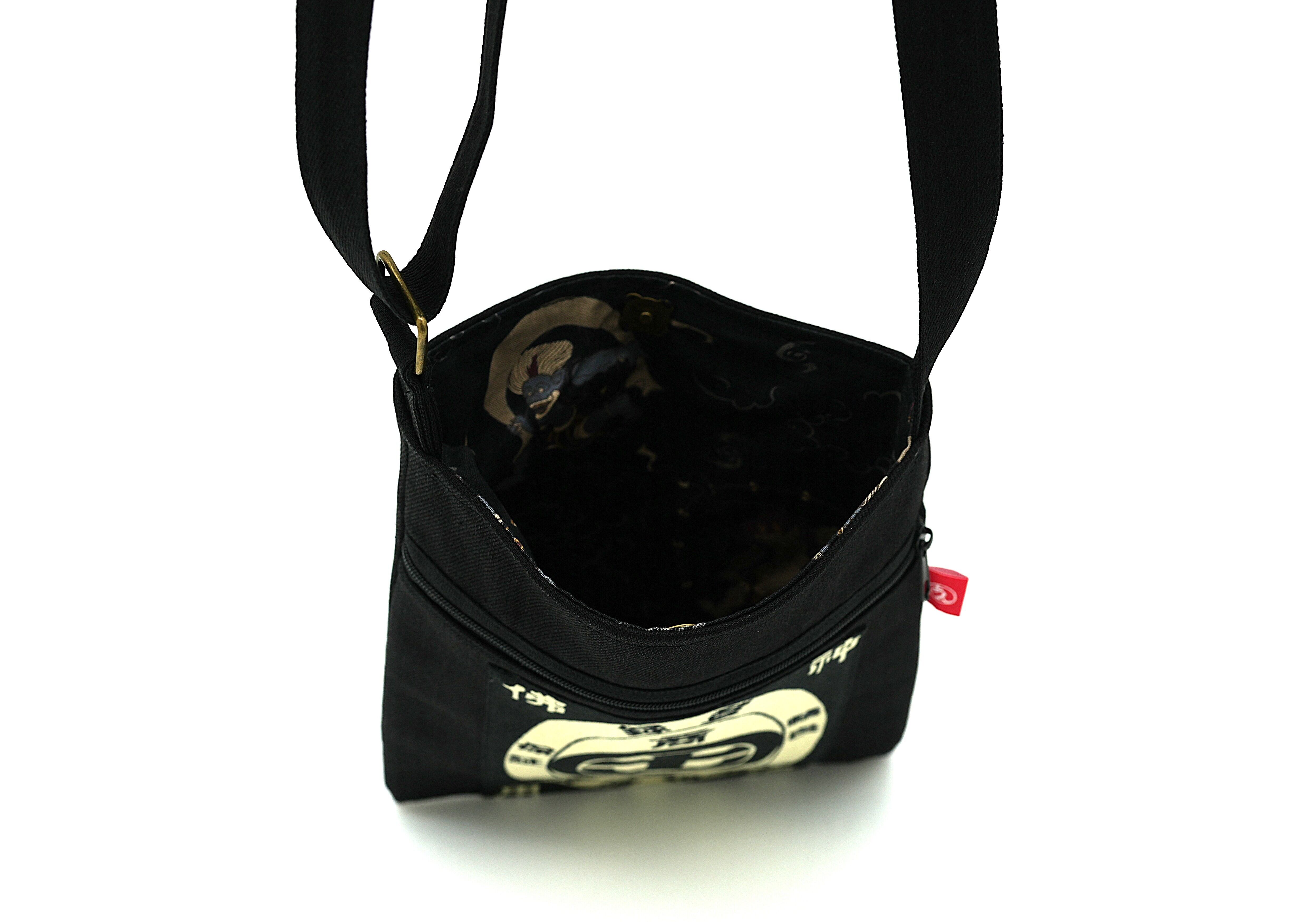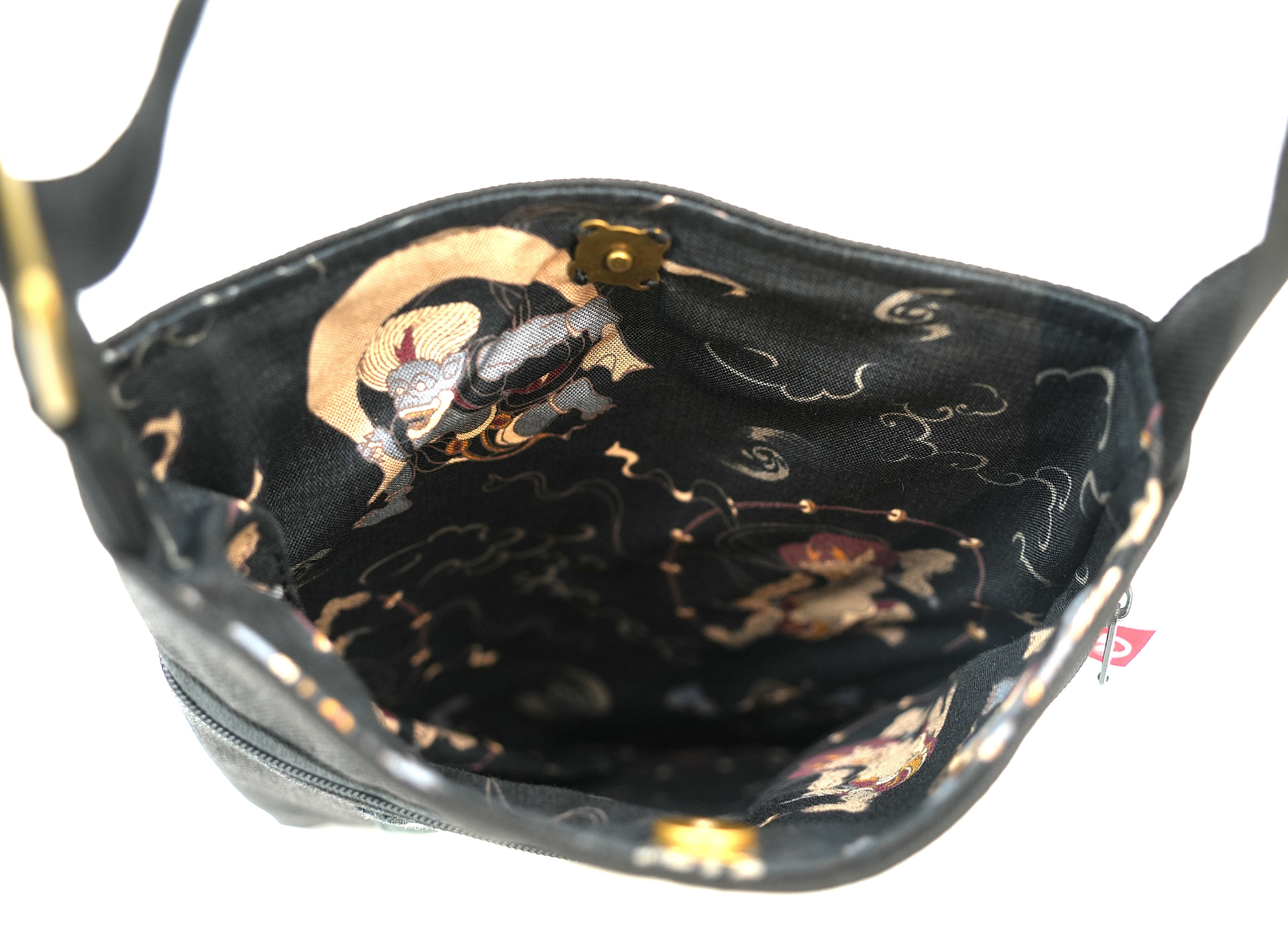 The outer fabric features a retro front-apron style print inspired by old shop aprons, while the lining hides images of the gods of wind and thunder.